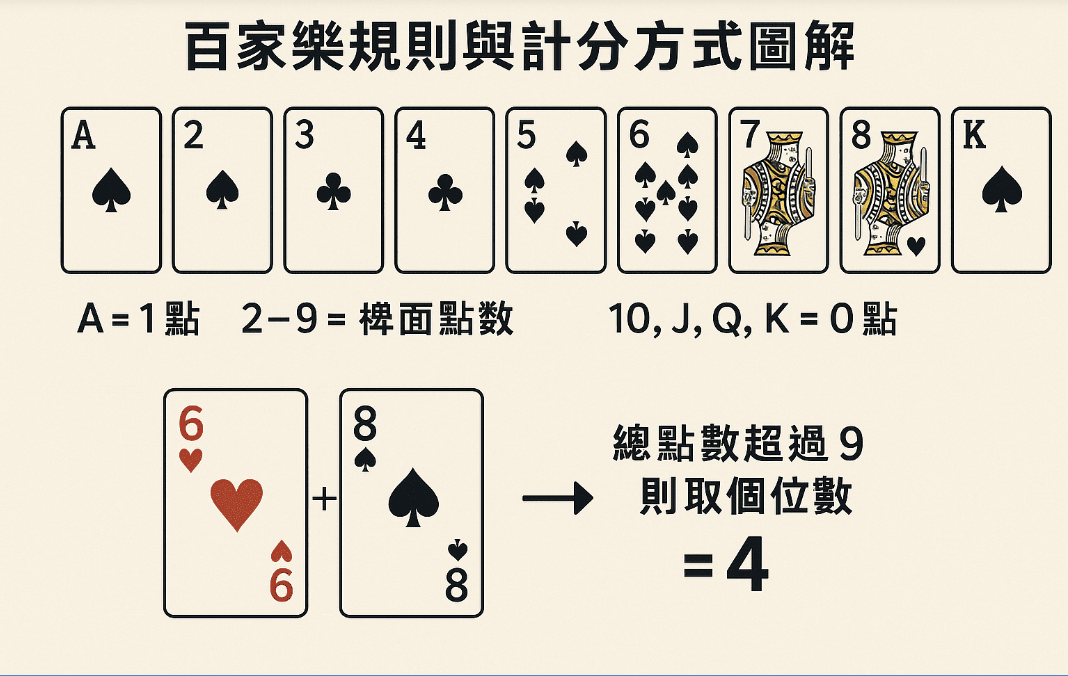 百家樂通常使用 8 副牌(共416張),去除大小鬼。玩家可在「莊家」、「閒家」、「和局」之間選擇投注,最終由哪一方的點數接近 9 點即為勝方。計分方式如下: